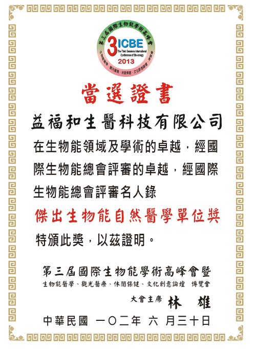 榮獲國際生物能傑出醫學單位獎